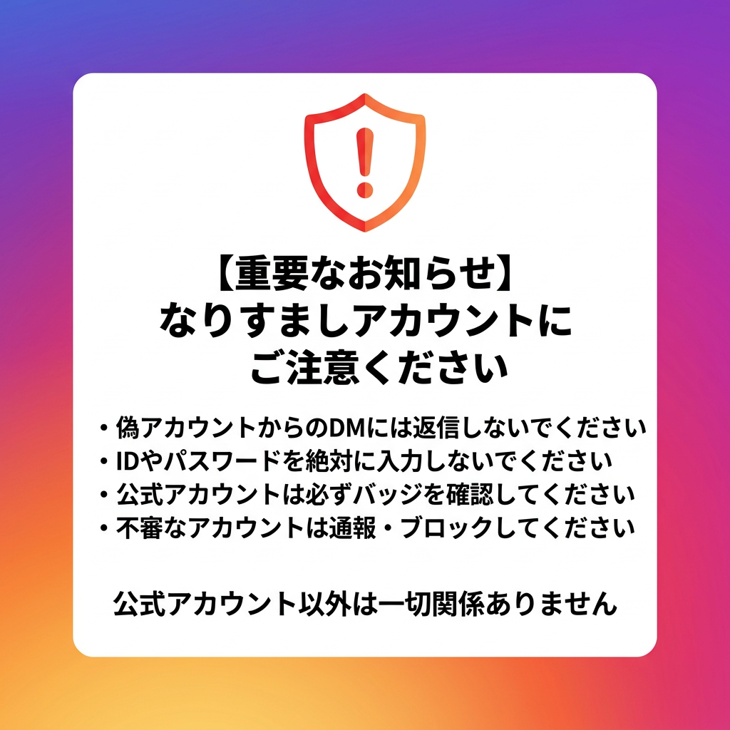 偽アカウントから何らかのアクションがあった場合でも、フォローバックをしない、DMに返信しない、個人情報等を入力しないなど、十分ご注意くださいますようお願い申し上げます。